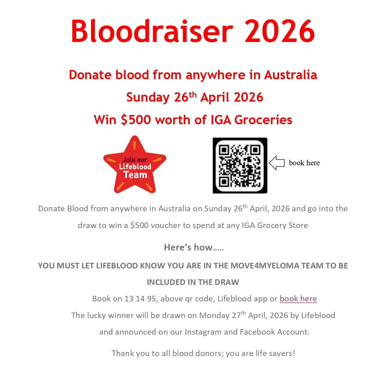 Book on 13 14 95, above qr code, Lifeblood app or book here: https://my.donateblood.com.au/app/jointeam. The lucky winner will be drawn on Monday 27th April, 2026 by Lifeblood and announced on our Instagram and Facebook Account.